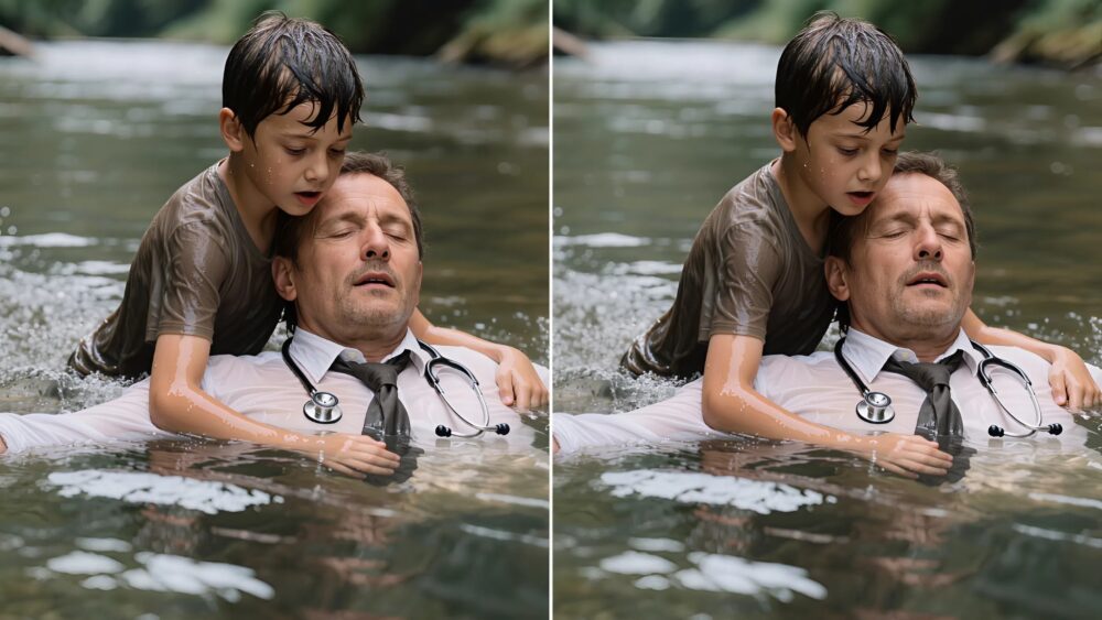 Der Mann kam nur langsam wieder zu sich, atmete gierig, als müsste er das Leben neu erlernen. Sein noch verwirrter Blick blieb schließlich auf dem Jungen hängen — durchnässt, zitternd, mit Tränen in den Augen.